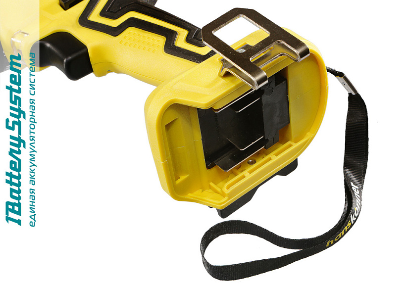 Данная модель является частью системы 1BatterySystem и совместима со всей линейкой аккумуляторного инструмента. Два Li-Ion аккумулятора на 2 Ah с до 3000 зарядок и собственной системой защиты от перегрузки, перегрева и глубокого разряда обеспечат полную непрерывность в работе. Функция быстрой зарядки зарядного устройства полностью восстановит работоспособность аккумулятора всего за 60 минут или за 35 минут до 80%.