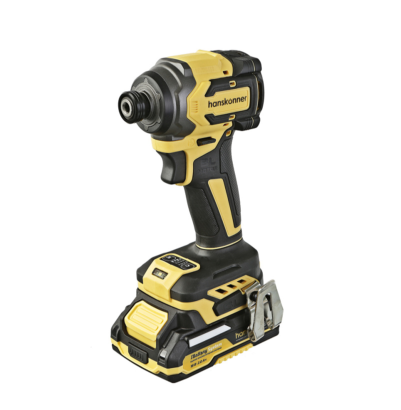 Hanskonner HCD20280BLWC – аккумуляторный 18 В, ударный винтоверт с типом гнезда под шестигранник 1/4 ″ – является частью системы 1BatterySystem, обеспечивающей совместимость одного и того же аккумулятора с целым рядом наименований инструмента. Модель обладает максимально сбалансированной компоновкой: небольшие размеры корпуса и рукояти позволяют эффективное использование в условиях с затрудненным доступом, а нейтральный центр тяжести, и обилие прорезиненных противоскользящих поверхностей способствуют надежному хвату, и лучшему контролю. Винтоверт оснащен 18 В бесщеточным двигателем, характеризующимся на 30% лучшей производительностью в сравнении с коллекторными аналогами. Кроме того, бесщеточный двигатель отлично справляется с кратковременными перегрузками и не склонен к перегреву. Благодаря применению мощного планетарного механизма, Hanskonner HCD20280BLWC уверенно демонстрирует высокие показатели крутящего момента (до 280 Н м), что позволяет работать с крепежом большой длины и диаметра. Винтоверт имеет четыре режима настройки момента затяжки: 60 Н м, 120 Н м, 180 Н м, 280 Н м – пользователь выбирает нужный, исходя из конкретного материала и крепежа. Модель оснащена функцией AutoStop, плавно останавливающей вал шпинделя сразу после откручивания крепежа. К особенностям Hanskonner HCD20280BLWC стоит отнести эффективную LED-подсветку рабочей зоны WorkingLight с блоком коллиматорных линз, создающих направленный симметричный луч, а также индикатор остаточного заряда аккумулятора PowerCheck. Дополнительному комфорту использования способствуют специальная зацепная скоба крепления на пояс и страховочный ремешок на руку. Винтоверт штатно комплектуется двумя литий-ионными (Li-ion) аккумуляторами емкостью 2.0 А ч с возможностью подзарядки от него через USB выход сторонних гаджетов, импульсным зарядным устройством, USB LED-фонарем, запитываемым от АКБ.