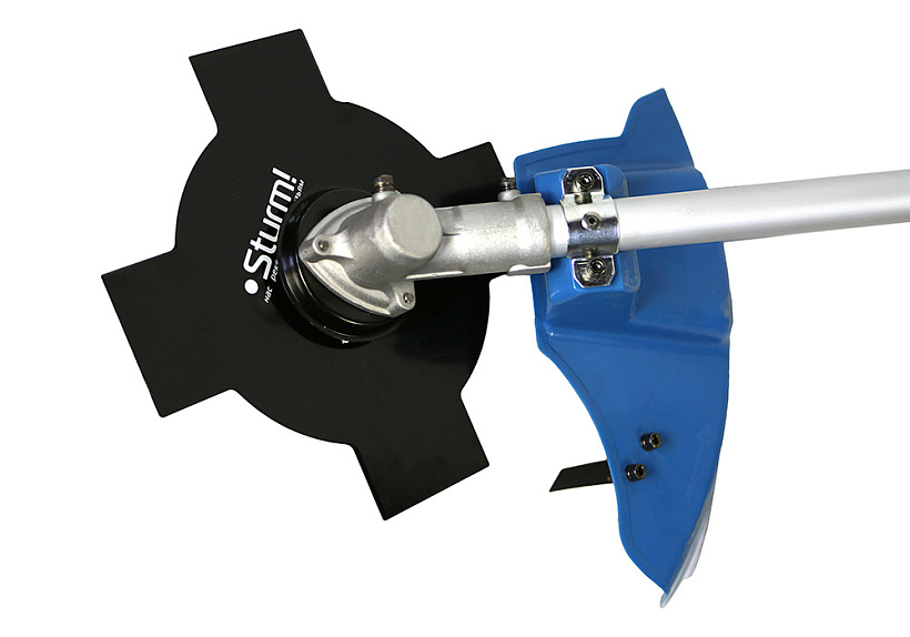 Sturm BT36 – универсальный триммер линейки инструмента единой аккумуляторной системы 1BatterySystem. Предназначен для эффективной обработки приусадебных территорий малых и средних площадей. Питание инструмента осуществляется от двух 18В аккумуляторов. Модель оснащена бесщеточным двигателем, характеризующимся высокой производительностью при минимальном расходе энергии, а также прямой неразъемной штангой с высокопрочным валом внутри, способным передавать значительный крутящий момент, и мощным редуктором – все это позволяет эффективно использовать инструмент с различными типами режущей оснастки, включая не только косильные головки, но и металлические ножи и фрезы. Система плавного пуска исключает стартовый рывок при запуске инструмента, а система поддержания постоянного количества оборотов обеспечивает стабильную работу триммера даже при изменении нагрузки, например, при соприкосновении оснастки с более жесткой травой. Важной особенностью модели Sturm BT36 является наличие двух скоростных режимов работы. Первая, пониженная скорость (0 – 4000 об / мин) предназначена для работ с молодой и мягкой травой, вторая скорость – для работ с более жесткой растительностью. Удобству настройки триммера под конкретного пользователя способствуют возможность продольной регулировки Т – образной рукояти, а также возможность настройки положения проушины крепления ремня. В расширенную штатную комплектацию Sturm BT36 помимо плечевого ремня и аксессуаров для сборки, и настройки включены полуавтоматическая головка с нейлоновой леской, а также металлический четырехлопастной нож.