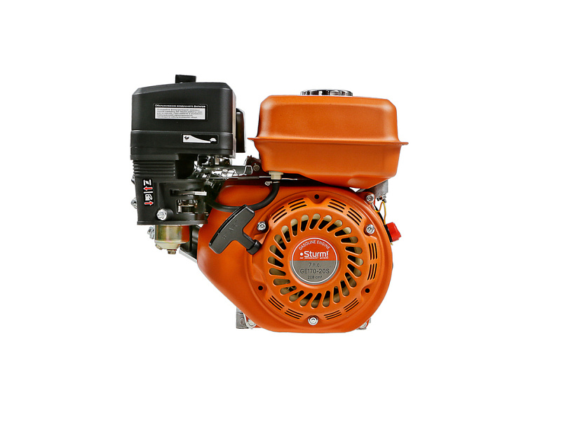 Sturm GE170-20S – четырехтактный одноцилиндровый бензиновый двигатель воздушного охлаждения. Предназначен для установки на мотоблоки, культиваторы, мотопомпы, снегоуборщики, скарификаторы и другую садовую технику. Рабочий объем – 208 см3. Мощность – 5.2 кВт. Характеризуется высокой надежностью, долговечностью и простотой в обслуживании. В конструкции силового агрегата применен ряд хорошо отработанных и проверенных технических решений: покрытая твердым хромом поршневая группа, кованый коленчатый вал, усиленный картер, электронная бесконтактная система зажигания, карбюратор, обеспечивающий стабильность работы при различных температурных условиях. Особенностью модели Sturm GE170-20S является система автоматической остановки и блокировки запуска при низком уровне масла, предотвращающая работу двигателя без наличия достаточного количества масла в картере. Эффективную фильтрацию воздуха на впуске обеспечивает сухой воздушный фильтр. Система запуска – с помощью ручного стартера.
