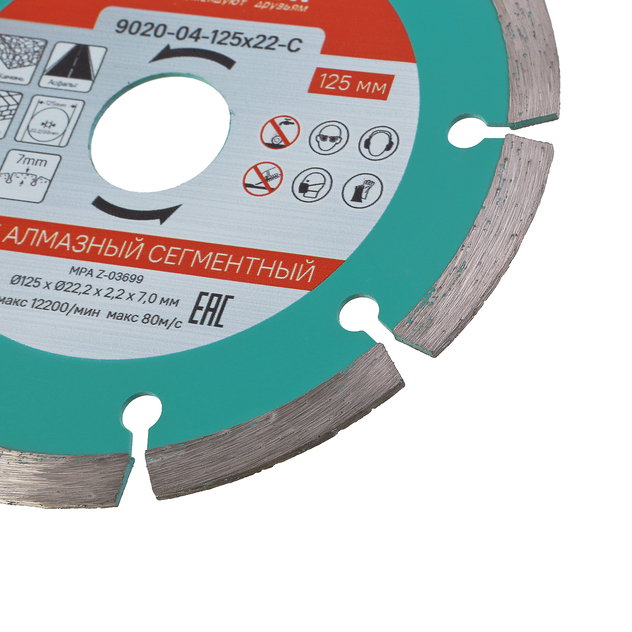 Диск алмазный Sturm! 9020-04-125x22-C сегментного типа для резки различных материалов: камня, кирпича, бетона, асфальта и тротуарной плитки. Режущая кромка с оптимальным содержанием алмазного слоя обеспечивает эффективную работу и низкую износостойкость. Промежутки между сегментами способствуют лучшему охлаждению и выбросу пыли. Тело диска, изготовленное из стали марки 65Г, обеспечивает его прочность и упругость. Переходное кольцо на 20мм в комплекте для использования с электрическим плиткорезом или иным инструментом.