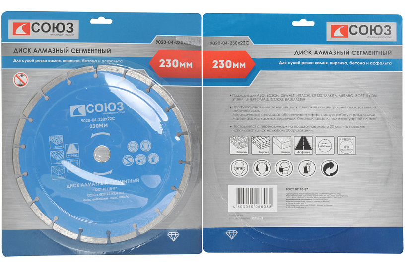 Сегментный алмазный диск, 230х22,2, Союз