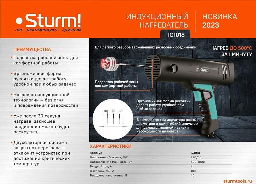 Нагреватель индукционный Sturm! IG1018 предназначен для разблокировки ржавых, поддавшихся коррозии, соединений, гаек, болтов, а также для нагрева и сгибания металлических прутков. Индукционный нагреватель преобразует электрическую энергию в высокочастотное переменное магнитное поле. Это магнитное поле, взаимодействуя с металлической токопроводящей рабочей области заставляет электроны в металле вибрировать, согласно принципу электромагнитной индукции. Кинетическая энергия движущихся электронов переходит в тепловую, которая нагревает метал.