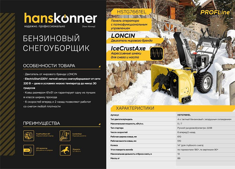 Hanskonner HSTG7661EL — мощный и производительный самоходный бензиновый снегоуборщик с максимальным уровнем оснащения. Предназначен для расчистки территорий средней и большой площади от снега различной плотности, как свежевыпавшего, так и слежавшегося.