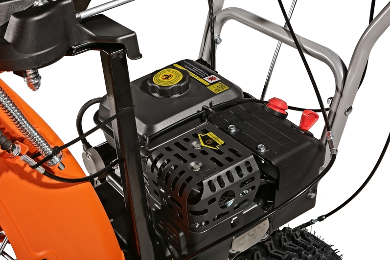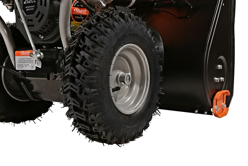 Sturm STG7461EL — универсальный самоходный бензиновый снегоуборщик. Предназначен для расчистки территорий средней и большой площади от снега различной плотности, как свежевыпавшего, так и слежавшегося. Модель оснащена надежным и неприхотливым четырехтактным двигателем KC (рабочий объем 196 см3, мощность 7 л.с.), специально адаптированным для зимней эксплуатации, а также многоступенчатой трансмиссией, значительно повышающей универсальность машины. Конструкцией предусмотрены четыре скорости движения вперед и одна назад. Низшая передача применяется при уборке плотно слежавшегося и мокрого снега, средние передачи — для работы со свежевыпавшим снегом, высшая передача — транспортный режим, предназначенный преимущественно для перемещения снегоуборщика. Важная особенность модели Sturm STG7461EL — наличие системы электрозапуска: благодаря встроенному электростартеру запуск снегоуборщика максимально удобен и прост. При необходимости, пользователь может также осуществлять запуск и с помощью ручного стартера. Высокая производительность машины обеспечивается не только мощным двигателем, но и продуманной конструкцией забора снега — этому способствует использование мощных агрессивных шнеков с большим профилем зуба, позволяющих легко справляться даже со слежавшимся снегом и настом, а также вместительного снегозагребного ковша, гарантирующего внушительную ширину прохода и возможность убирать сугробы до полуметра высотой. Снегоуборщик оснащен надежным металлическим выпускным желобом, с регулировкой по направлению выброса. Поворот желоба осуществляется дистанционно, посредством специального рычага на панели. Кроме того, предусмотрена возможность настройки угла выброса, благодаря которой регулируется необходимое расстояние выброса снежной массы. Максимальная дальность достигает 11 метров. Удобство эксплуатации в сумерках и темное время суток обеспечивает мощная LED-фара — в условиях короткого зимнего дня ее наличие является важной составляющей эффективной работы. Для лучшего сцепления с поверхностью модель комплектуется широкими пневматическими шинами с глубоким протектором.