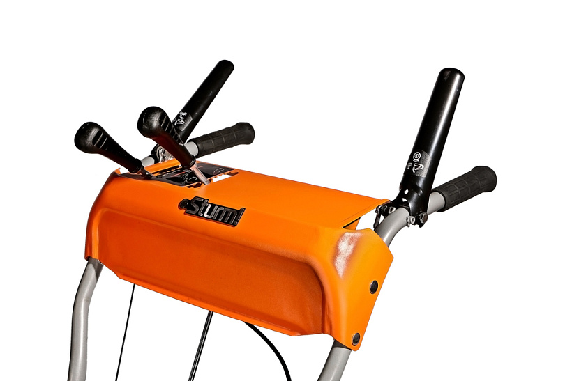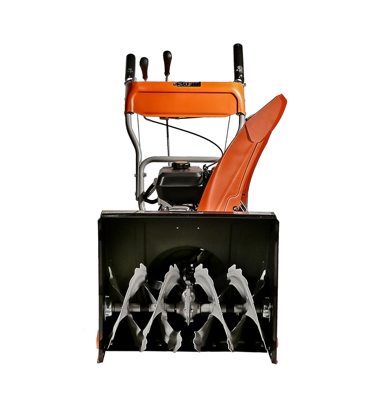 Sturm STG7661 — универсальный самоходный бензиновый снегоуборщик. Предназначен для расчистки территорий средней и большой площади от снега различной плотности, как свежевыпавшего, так и слежавшегося. Модель оснащена надежным четырехтактным двигателем KC, специально адаптированным для зимней эксплуатации, а также многоступенчатой трансмиссией, с шестью скоростями движения вперед и двумя назад. Низшие передачи применяются при уборке плотно слежавшегося и мокрого снега, средние передачи — для работы со свежевыпавшим снегом, высшая передача — транспортный режим, предназначенный преимущественно для перемещения снегоуборщика. Высокая производительность машины обеспечивается не только мощным двигателем, но и продуманной конструкцией забора снега — этому способствует использование мощных агрессивных шнеков большого диаметра (31 см), позволяющих легко справляться даже с плотным слежавшимся снегом и настом, а также применение вместительного снегозагребного ковша, гарантирующего внушительную, одну из лучших в классе, ширину прохода в 61 см и возможность убирать сугробы до полуметра высотой. Снегоуборщик оснащен надежным металлическим выпускным желобом, с регулировкой по направлению выброса. Поворот желоба осуществляется дистанционно, посредством специального рычага на панели. Кроме того, предусмотрена возможность настройки угла выброса, благодаря которой регулируется необходимое расстояние выброса снежной массы. Маневренность и проходимость машины обеспечивают штатные широкие пневматические шины с глубоким протектором.