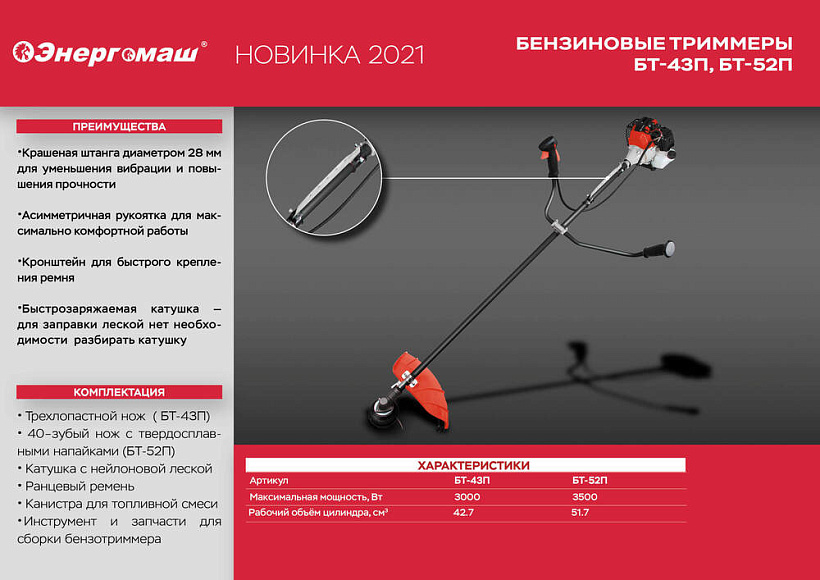 Оптимальный комплект рабочей оснастки подобран для любых условий кошения от простого подравнивания до обработки сложных участков.