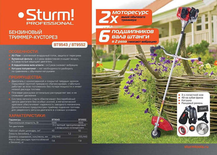 Оптимальный комплект рабочей оснастки подобран для любых условий кошения от простого подравнивания до обработки сложных участков.