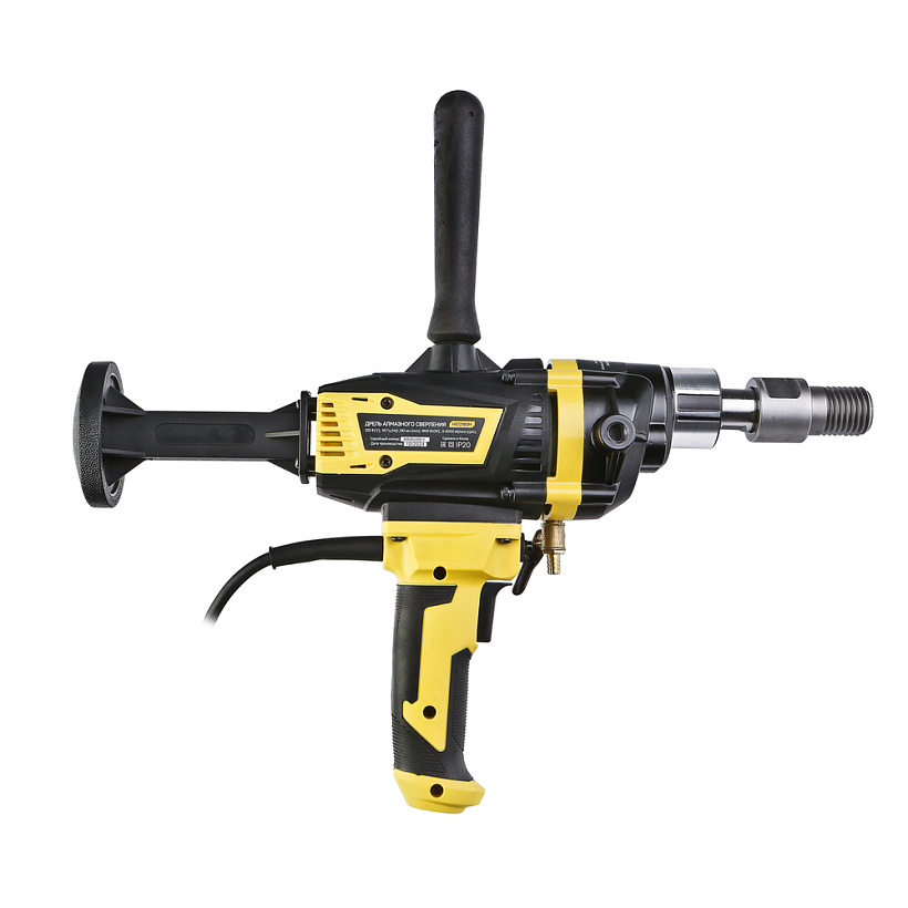 Применение в конструкции фирменных японских подшипников NSK повышенного ресурса способствует исправной и долговечной эксплуатации электроинструмента. Удобству в практическом обращении с дрелью содействует адаптер под алмазные коронки с хвостовиком 1 1/4", идущий в комплекте, фиксатор-липучка расположенный на кабеле и блокировка выключателя во включенном положении при длительных работах. Регулировка частоты вращения осуществляется усилием, приложенным к кнопке включения.