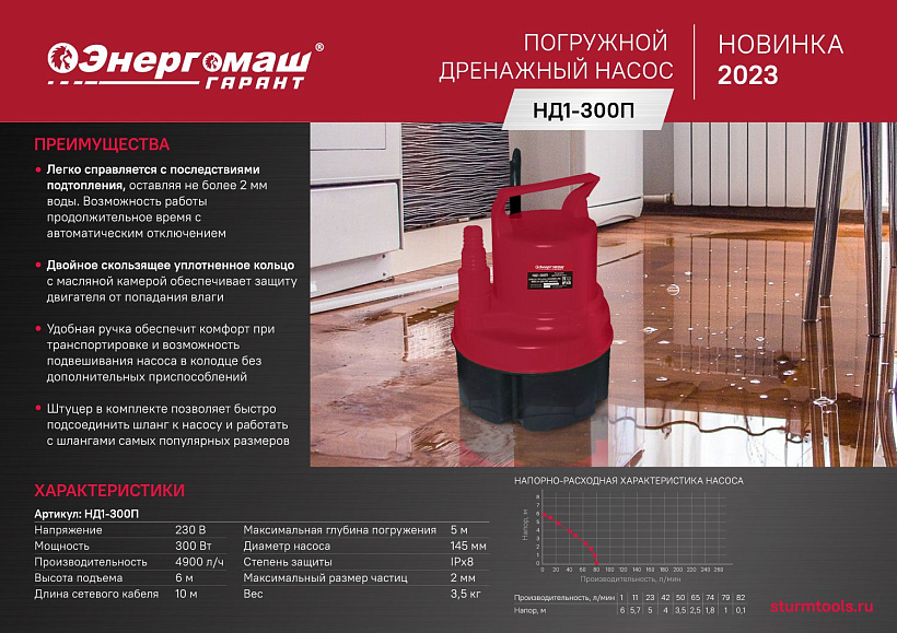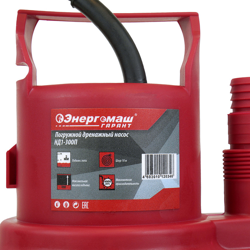 Насос погружной дренажный Энергомаш ГАРАНТ НД1-300П предназначен для откачивания относительно чистой воды из подвалов, погребов, дренажных приямков, колодцев и т.п. При этом минимальный уровень воды может быть всего 2 мм, что делает его уникальным и незаменимым для откачки воды из хозяйственных сооружений в период паводков – данный насос может наиболее полно убирать воду.