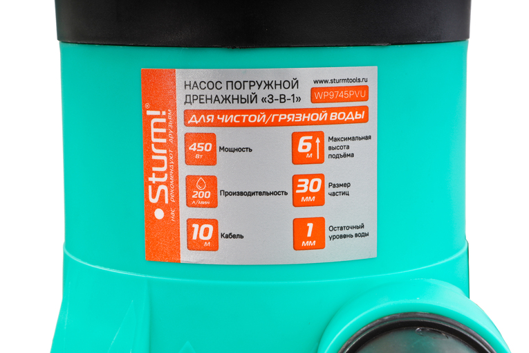 Насос погружной дренажный Sturm! WP9745PVU с уникальным решением съемных платформ предназначен одновременно для перекачки и чистой и грязной воды с максимальным содержанием частиц от 1 до 30мм.