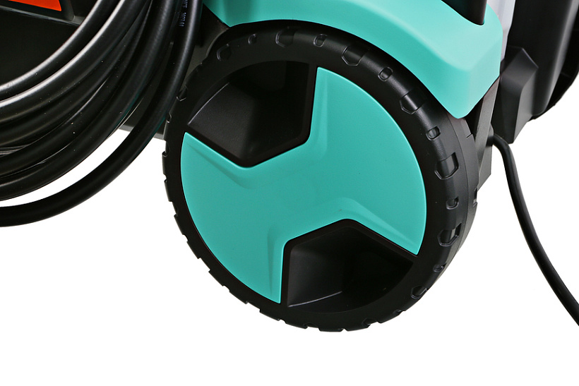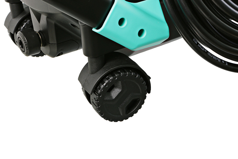 В конструкции мойки предусмотрено 4 колеса: 2 основных для перемещения в вертикальном положении за ручку и 2 дополнительных поворотных для перемещения в горизонтальном положении за шланг в след за пользователем.