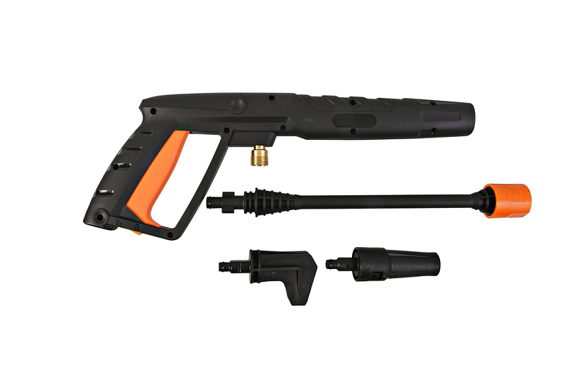 Мойка высокого давления, пистолет-распылитель, направляющая трубка, веерная фреза, грязевая фреза, угловая фреза, шланг высокого давления, рукоятка, фильтр для воды, игла для прочистки форсунок, инструкция по эксплуатации.