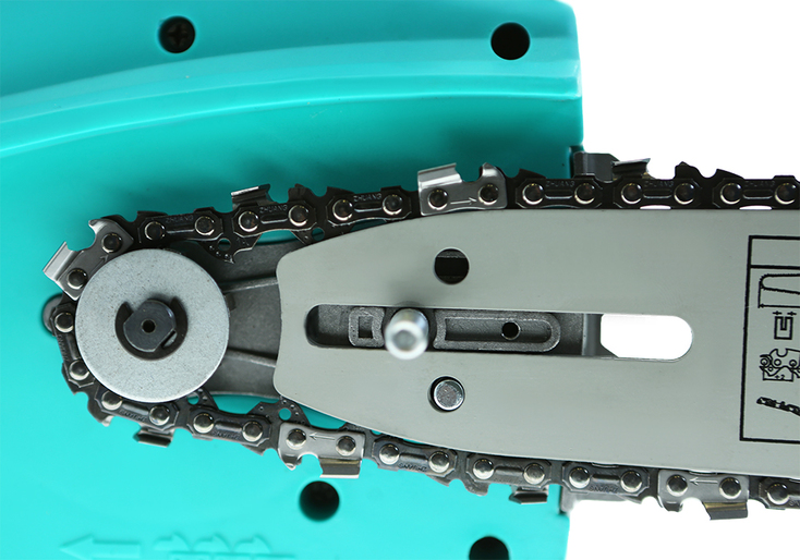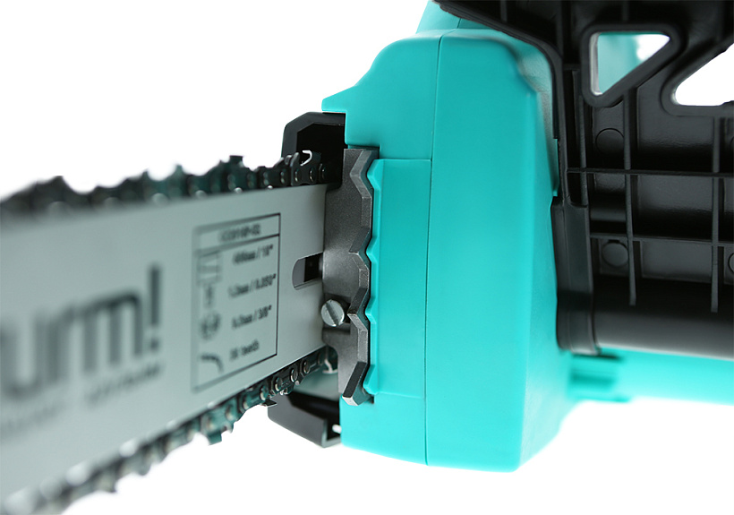 Безопасность оператора обеспечивает мгновенный тормоз цепи. Защитный кожух закрывает цепь и позволяет безопасно хранить или транспортировать пилу.