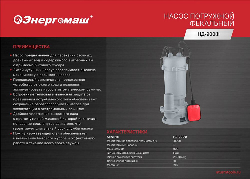 Насос погружной дренажный Энергомаш НД-900Ф предназначен для откачивания холодной (до 35 градусов) жидкости из выгребных ям, септиков, канализационных коллекторов.