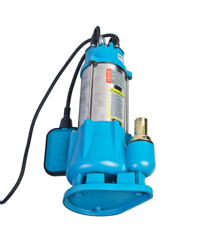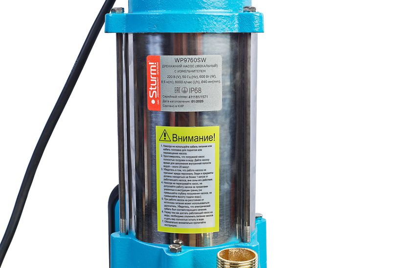 Sturm! WP9760SW – погружной дренажный насос – предназначен для откачивания жидкости из выгребных ям, септиков, канализационных коллекторов. Имеет комбинированный корпус: основание выполнено из прочного чугуна – это необходимо для свободного погружения насоса в сточные водные массы, корпус двигателя – из нержавеющей стали, стойкой к воздействию агрессивной среды.  При мощности электромотора в 600 Вт модель характеризуется высокой производительностью – способна перекачивать за час до 6000 литров жидкости и обеспечивать ее подачу на высоту до 8,5 метров, осуществляя забор с глубины до 5 метров. Максимальная температура жидкости для насоса не должна превышать 35 градусов. Важная особенность модели Sturm! WP9760SW – наличие в конструкции специального режущего узла, позволяющего измельчать крупные фракции, а также изготовленной из чугуна крыльчатки, устойчивой к окислительным воздействиям. Насос снабжен   поплавковым выключателем, который автоматически способен включать / выключать насос в зависимости от изменения уровня вод. Предусмотрена встроенаая термозащита – она автоматически отключает насос при перегреве и позволяет возобновить работу при последующем остывании до рабочей температуры. Установлен съемный выходной штуцер на резьбовом соединении, позволяющий кроме рукава подсоеденять ПНД или стальную трубу через резьбовое соединение.е.