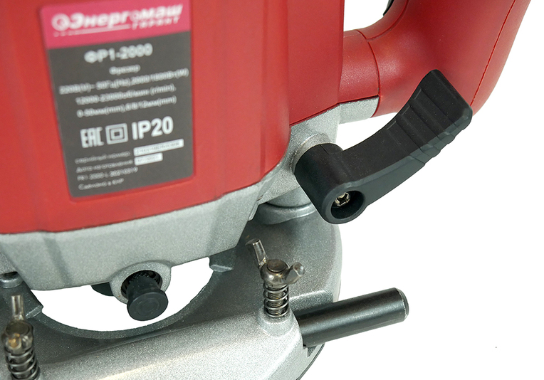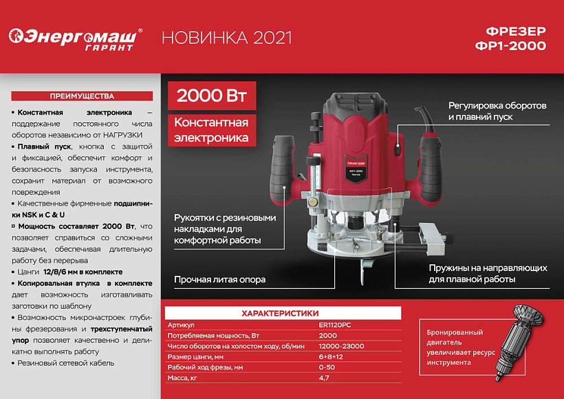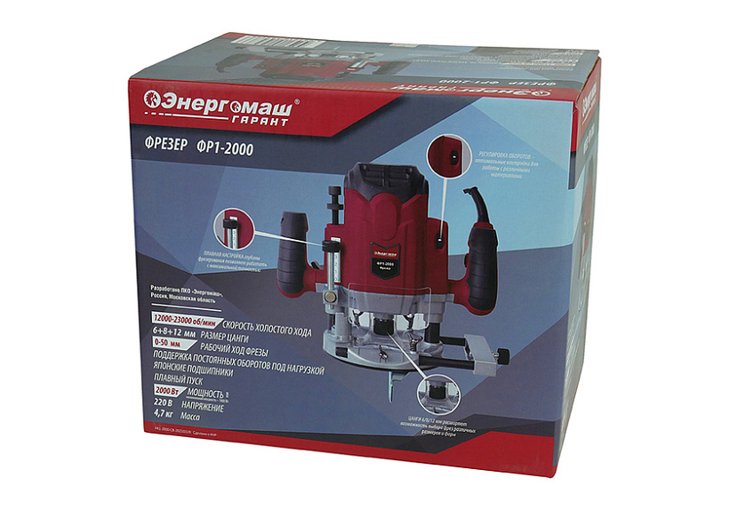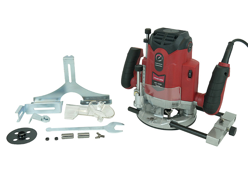 В зависимости от характеристик обрабатываемого материала устанавливается скорость вращения - от 12000 до 23000 об/мин. Мощный электродвигатель фрезера (2000 Вт) позволяет обрабатывать заготовки из пород деревьев различной твердости. Удобные прорезиненные рукоятки обеспечивают хорошую управляемость и контроль за процессом обработки. Для повышения надежности и продления срока жизни инструмента в механизме установлены качественные подшипники NSK (Япония), установлены система плавного пуска и система поддержания оборотов под нагрузкой. В комплект поставки  входят цанги 6, 8 и 12 мм, параллельная направляющая с возможностью точной регулировки. Для безопасности пользователя установлен прозрачный защитный щиток, предусмотрена возможность подключения пылесоса.