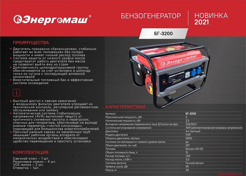 Быстрый и легкий запуск двигателя и надежная работа генератора обеспечивается электронной системой зажигания и системой автоматической декомпрессии.