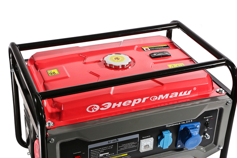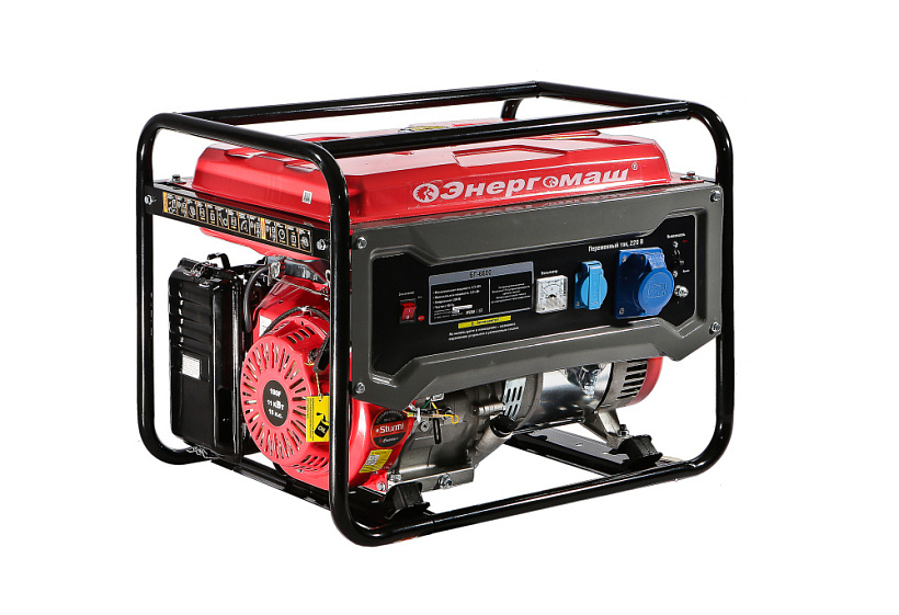 Генератор Энергомаш БГ-6600. Компактный однофазный генератор для организации мобильного энергоснабжения. Аппарат предназначен для мобильного обеспечения электроэнергией потребителей при отсутствии электроснабжения или в походных условиях. Отличный выбор для садового участка, гаража, небольшой торговой точки или организации удаленного рабочего места. Быстрый и легкий запуск двигателя и надежная работа генератора обеспечивается электронной системой зажигания и системой автоматической декомпрессии. Автоматическая система стабилизации напряжения (AVR) выполняет защиту от критичного снижения частоты и перегрузок, опасных для генератора, обеспечивая на выходе ровные параметры «чистой синусоиды», подходящей для большинства энергопотребителей. Прочный рамный каркас из закаленных труб защищает рабочие органы аппарата от механических воздействий и обеспечивают удобство перемещения и простоту установки. Система поддержания энергобезопасности автоматически отключает потребителей от генератора при возникновении короткого замыкания или перегрузки.