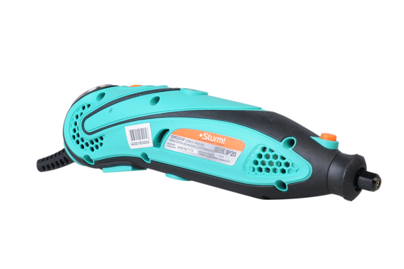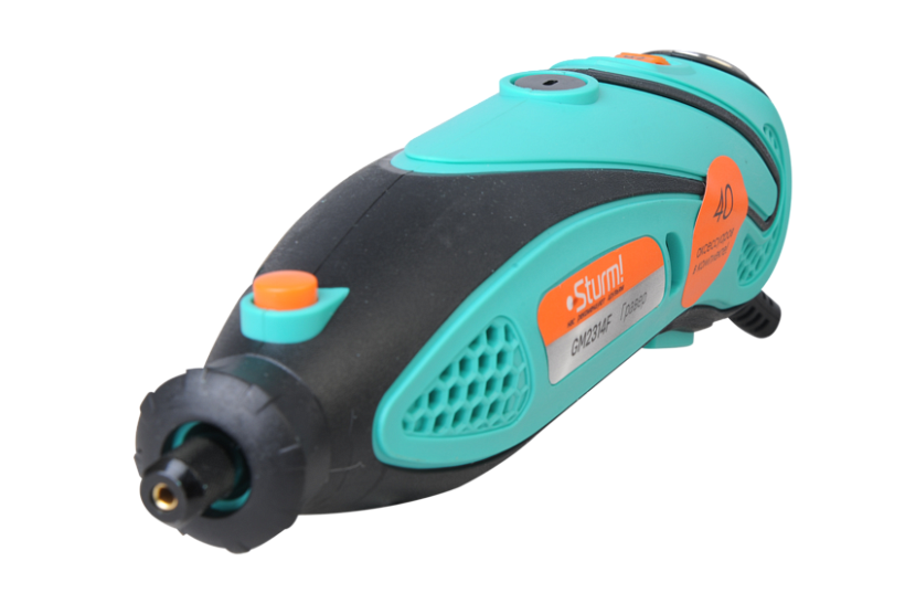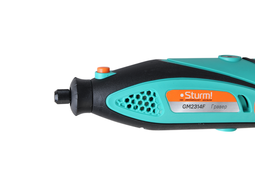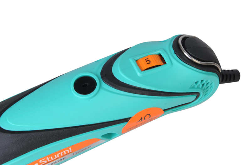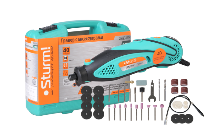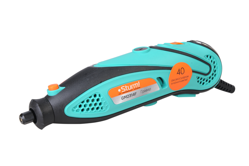 Sturm GM2314F - универсальный электрический гравер. Предназначен для выполнения различных мелких и точных работ: гравировки, шлифовки, полировки, сверления и резки. Инструмент имеет небольшие массогабаритные показатели, а также отличную эргономику ¬– все это способствует лучшему контролю рабочего процесса и надежности хвата. Благодаря гибкому валу значительно упрощается проведение работ в стесненных условиях и труднодоступных местах, а наличие на корпусе металлической скобы дает возможность подвесить гравер в любом удобном месте, тем самым, повышая комфорт использования. Модель оснащена функцией регулировки оборотов в широком диапазоне от 10000 до 32000 об / мин и позволяет выбрать оптимальный технологический режим для конкретного вида материала и оснастки. Система крепления насадок с использованием двух типовых диаметров (2.4 и 3.2 мм) фиксирующей цанги облегчает подбор оснастки и значительно расширяет диапазон применения устройства. Для легкой и удобной замены оснастки предусмотрена возможность блокировки вала шпинделя. Наличие функции быстрого доступа к щеткам позволяет проводить их замену без необходимости разборки корпуса инструмента. В комплекте с инструментом поставляется расширенный набор оснастки из 40 аксессуаров, а также гибкий вал и прочный пластиковый кейс.