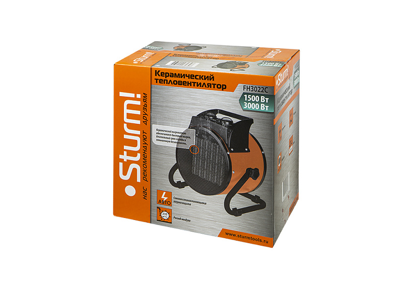Sturm FH3022C — мобильный керамический обогреватель для временного или постоянного обогрева жилых, производственных и вспомогательных помещений площадью до 40 м2. Главная особенность модели — применение в конструкции металлокерамического нагревательного элемента PTC, благодаря большой площади теплоотдающей поверхности которого гарантируется быстрый нагрев. Для того, чтобы обеспечить высокую производительность воздушного потока, проходящего через нагревательный элемент и ускорить циркуляцию нагретого воздуха в помещении, обогреватель оснащен встроенным мощным вентилятором с металлической крыльчаткой. Модель Sturm FH3022C имеет простое и интуитивно понятное управление — осуществляется парой регуляторов на верхней панели устройства. С помощью первого регулятора пользователь выбирает один из трех режимов работы: вентиляция без нагрева/теплый обдув/горячий обдув. Второй регулятор — управление настройкой термостата, задача которого — поддержание постоянной температуры в помещении. Для визуального контроля включенного устройства на панели управления также предусмотрен отдельный индикатор питания. Дополнительное удобство при использовании обеспечивает возможность регулировки направления воздушного потока посредством наклона корпуса обогревателя вверх-вниз, а также широкая опорная подошва по периметру, предотвращающая случайное опрокидывание устройства.