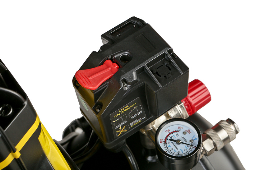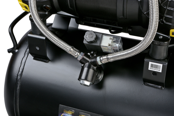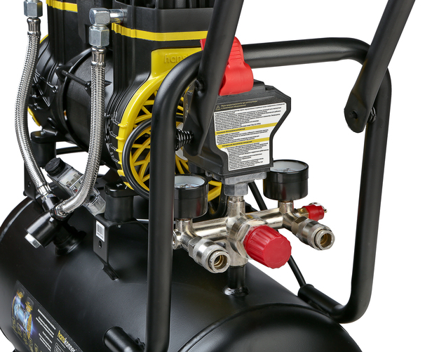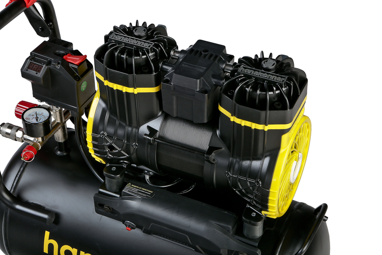 Современный 2-х цилиндровый двигатель c повышенным числом оборотов, скорость в два раза выше стандарта для безмасляных компрессоров. Легко запускается в минусовую температуру благодаря отсутствию в конструкции загустевающего на холоде масла. Возможность одновременной работы двух потребителей сжатого воздуха.