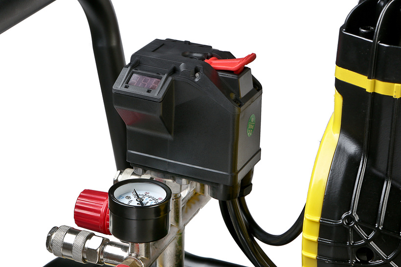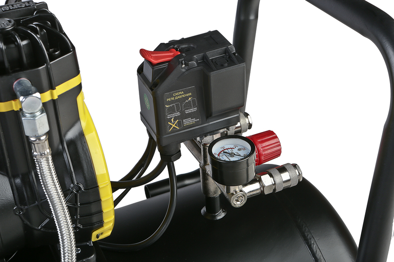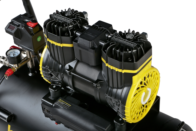 Современный 2-х цилиндровый двигатель c повышенным числом оборотов, скорость в два раза выше стандарта для безмасляных компрессоров. Легко запускается в минусовую температуру благодаря отсутствию в конструкции загустевающего на холоде масла. Возможность одновременной работы двух потребителей сжатого воздуха.