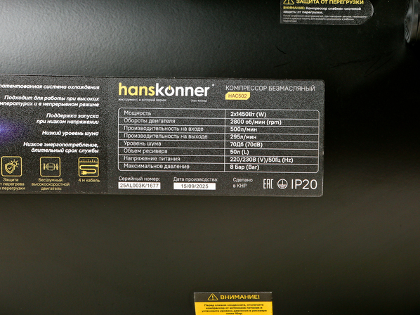 Hanskonner HAC502 - поршневой безмасляный компрессор нового поколения. Мощность данной модели составляет 2900Вт, производительность 500 л/мин, честный объем ресивера 50л., с максимальным давлением 8 бар.