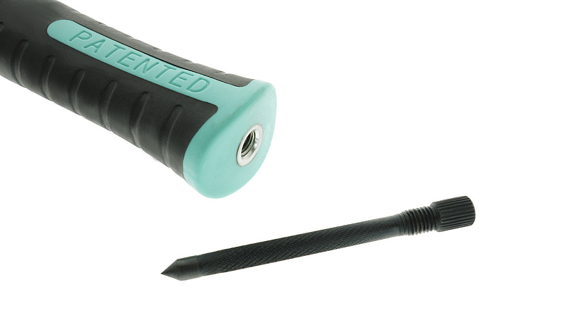 Резьбовая фиксация кернера исключает случайную потерю в ходе рабочего процесса, широкая рифленая захватная часть служит для удобного извлечения и возврата на место, чернение защищает от коррозии. Кованый боёк молотка, защита от раскола, обрезиненная фиберглассовая рукоятка амортизирует удар и создаёт удобный захват