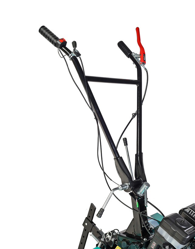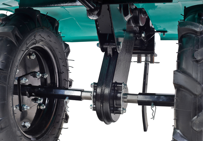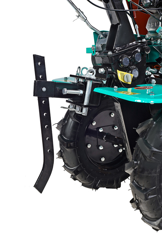 В оснащение мотоблока входит трансмиссия на основе трехступенчатого редуктора (2 ступени переднего хода и одна заднего) с реверсом, пара устойчивых ведущих колес, удобная система управления (рычаги и тумблеры непосредственно на руле). Есть набор устанавливаемых фрез. Ведущие колеса мотоблока – это пара стальных дисков с пневматическими шинами, с «болотным» протектором, не допускающим пробуксовки.