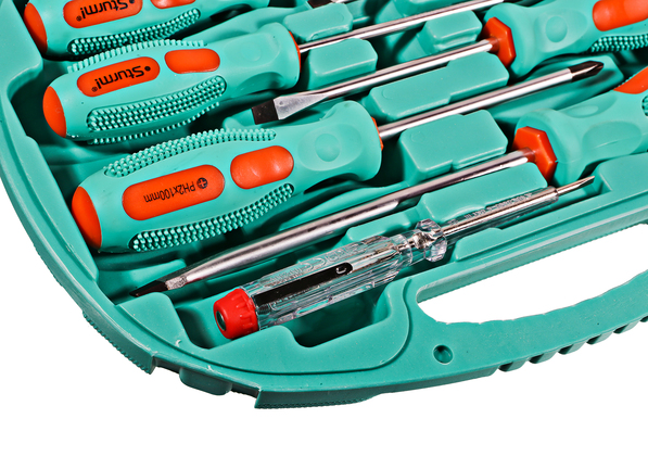 В прочном и удобном пластиковом кейсе-дисплее: отвертки SL: 3x75. 5x75. 6x100. 8x150 мм; PH: 1x75. 1x100. 2x100 мм; Тестер напряжения.