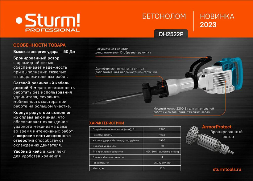 Отбойный молоток Sturm DH2522P — мощнейший электроинструмент для разрушения конструкций из бетона, железобетона, кирпича и камня, долбления асфальтовых, бетонных и плиточных покрытий, а также, с соответствующими принадлежностями, для вколачивания и трамбовки. Энергия удара в 50 Дж обеспечивает эффективное разрушение даже прочных конструкций. Патрон HEX 30 позволяет использовать широкий спектр профессионального расходного инструмента и производит его быструю замену.