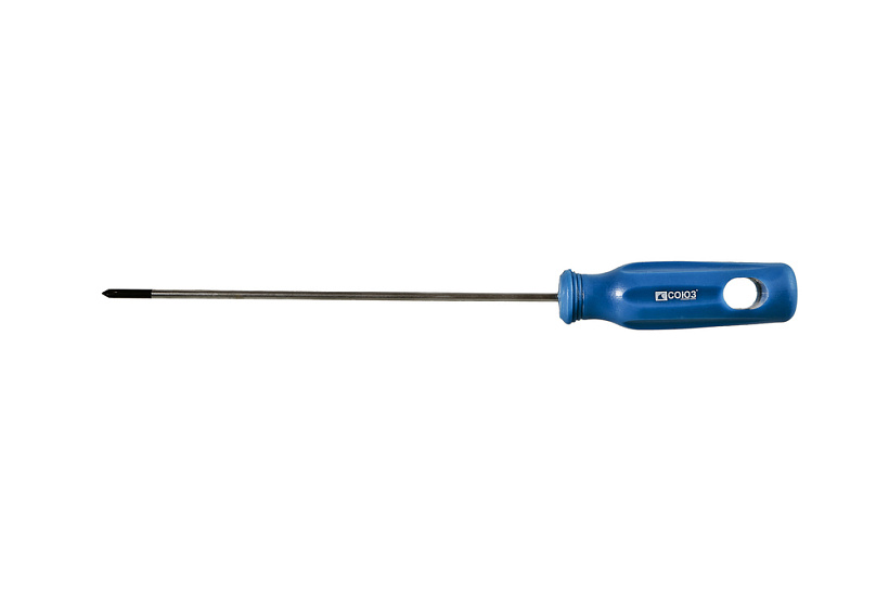 Эргономичная рукоятка с мягким резиновым покрытием, препятствующим проскальзыванию отвертки в руке. Рабочая часть отвертки выполнена из высоколегированной хромованадиевой инструментальной стали и имеет высокую твердость и прочность, что определяет длительный срок службы инструмента.