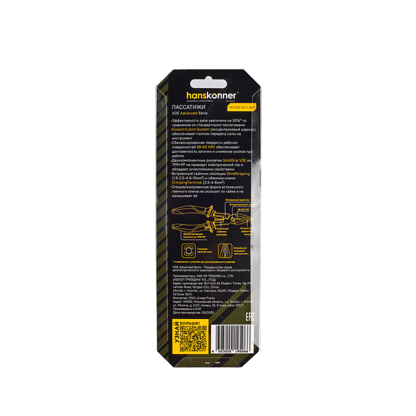Пассатижи 200мм, диэлектрические, эксц. шарнир, hanskonner