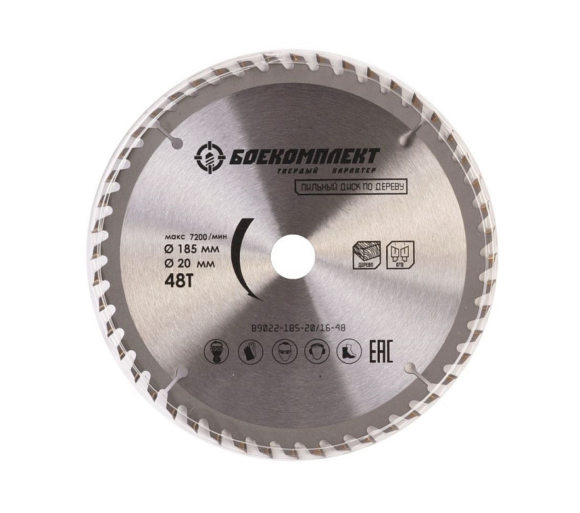 Диск пильный БОЕКОМПЛЕКТ B9022-185-20/16-48. Диск пильный по дереву предназначен для продольного и поперечного распила мягкой и твердой древесины, ДСП, МДФ, фанеры. Тело диска из высококачественной листовой стали обеспечивает его стойкость к деформации. Напайки диска из вольфрамкарбидного сплава ВК8, произведенного из первичного сырья, устойчивы к истиранию и имеют продолжительный ресурс работы, а оптимальный угол заточки в +10  ̊C предотвращает преждевременное затупление зуба диска.