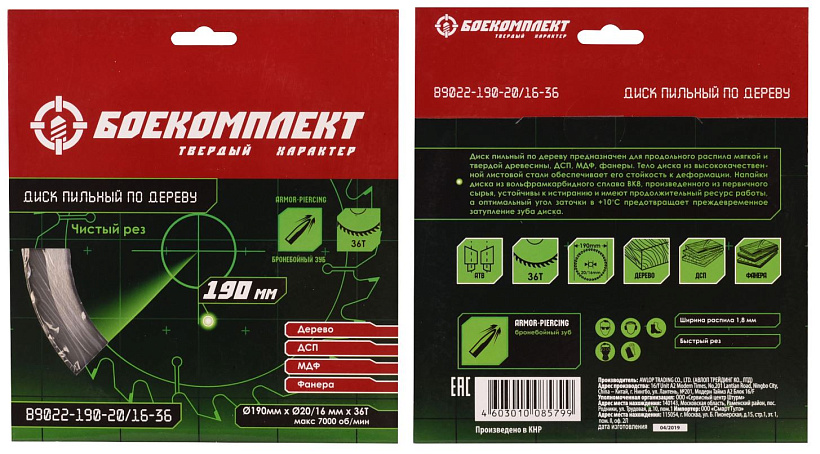 Пильный диск по дереву 190x20/16мм, 36 зубьев, БОЕКОМПЛЕКТ