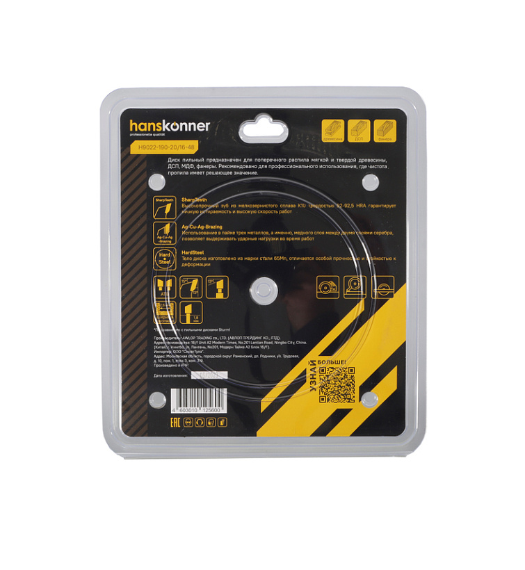 Пильный диск по дереву 190x20/16мм, 48 зубьев, Hanskonner