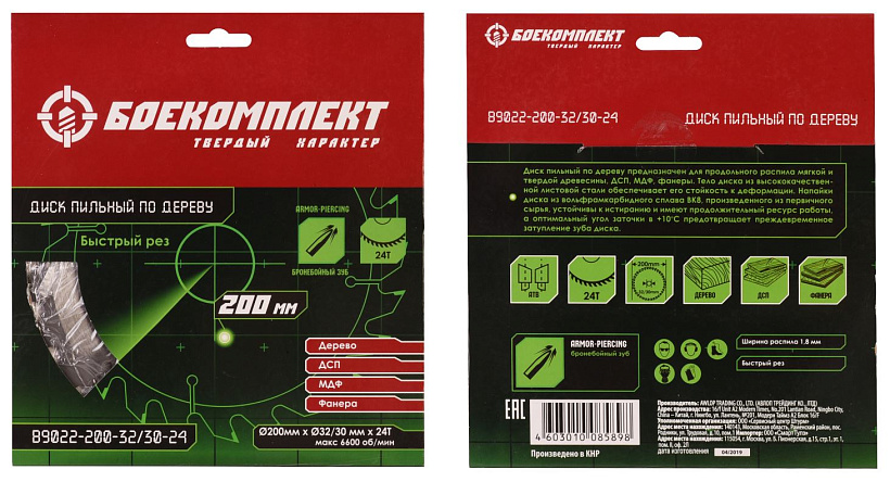 Пильный диск по дереву 200x32/30мм, 24 зубьев, БОЕКОМПЛЕКТ