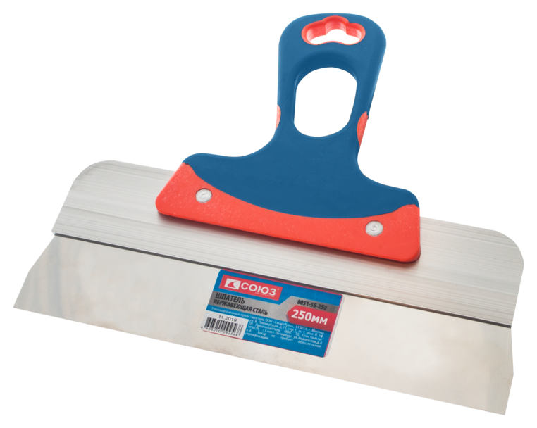 Шпатель СОЮЗ 8051-55-300 используется для нанесения и выравнивания строительных, декартивных растворов при работе с полом, стенами, потолком и другими декоративными. Инструмент имеет прочное трапецевидное лезвие, суженное у основания ручки. Полотно изготовлено из нержавеющей стали. Двухкомпонентная рукоятка нескользящая и приятная на ощупь.