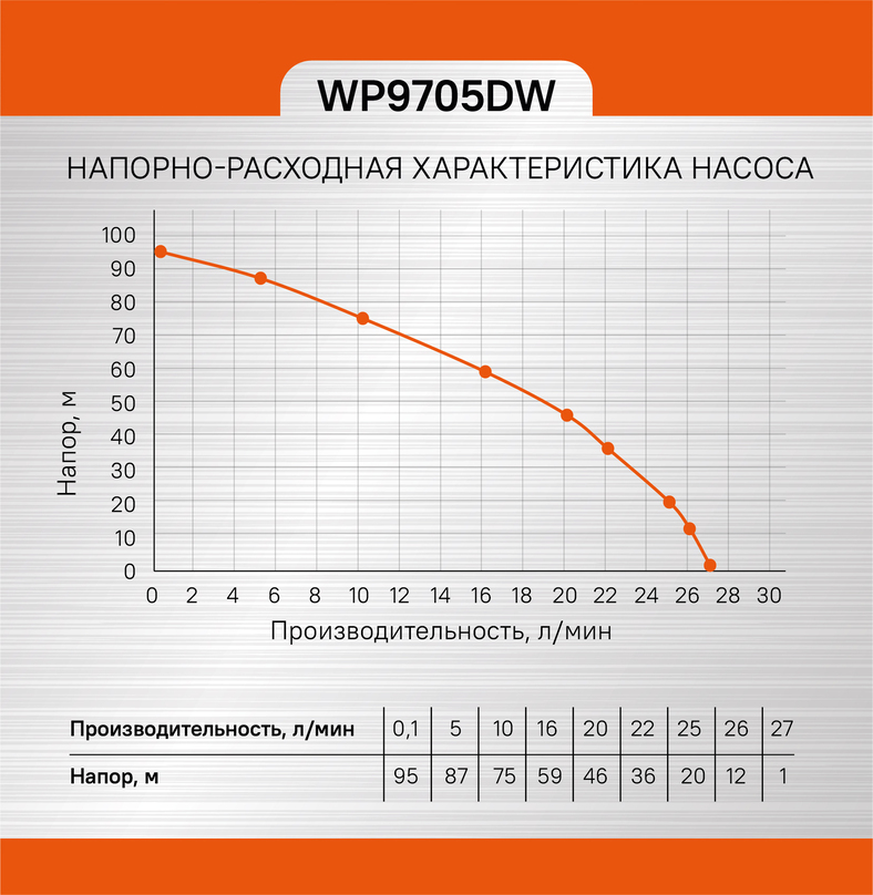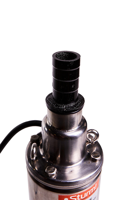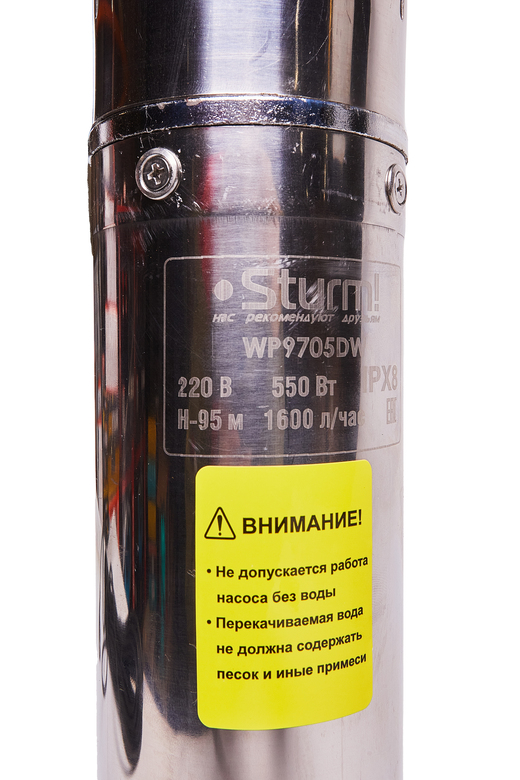 Sturm WP9705DW – погружной скважинный насос – предназначен для перекачивания чистой воды без песка или иных примесей из относительно неглубоких, узких скважин (минимальный диаметр скважины – 95 мм). Обладает небольшими габаритными размерами, благодаря чему удобен в транспортировке. Корпус устройства изготовлен из нержавеющей стали и стоек к воздействию агрессивной среды и механическим повреждениям. Модель оснащена рабочим элементом в виде винта-шнека и характеризуется высокой производительностью – способна перекачивать за час до 1600 литров жидкости и обеспечивать ее подачу на высоту до 95 метров, осуществляя забор с глубины до 30 метров. Максимальная температура перекачиваемой воды не должна превышать 40 °C. Двигатель насоса имеет масляное охлаждение, что способствует его малому износу в процессе эксплуатации. Также, в конструкции Sturm WP9705DW предусмотрена термозащита – она отключает питание при перегреве и позволяет возобновить работу при остывании устройства до рабочей температуры. Наличие длинного 20-ти метрового кабеля питания дает возможность установить насос на необходимой глубине погружения.