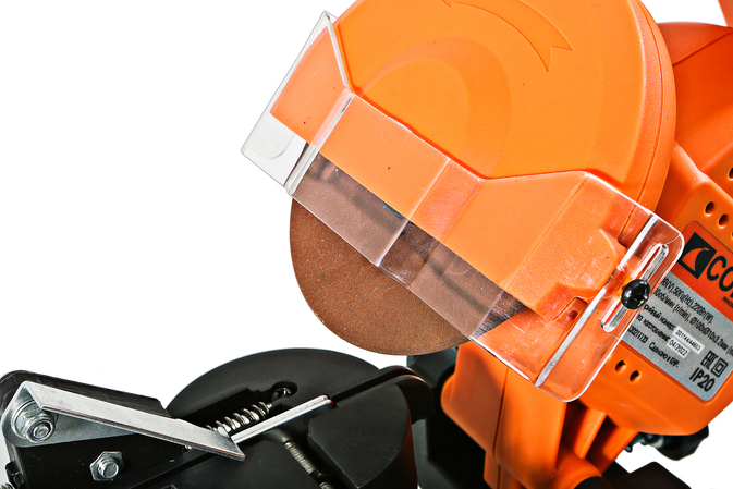 Для большей безопасности во время заточки в модели применена винтовая и клиновая фиксация обрабатываемого элемента, препятствующая его смещению и выскальзыванию из рабочего ручейка. Прижимной механизм обеспечивает точность зажима зубьев цепи под требуемым углом к рабочей поверхности абразивного диска для получения правильной конфигурации режущих плоскостей.