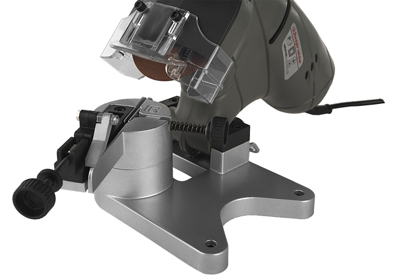 Прижимной механизм обеспечивает точность зажима зубьев цепи под требуемым углом к рабочей поверхности абразивного диска для получения правильной конфигурации режущих плоскостей. Применяемая двойная, винтовая и клиновая, фиксация обрабатываемого элемента, препятствует его смещению и выскальзыванию из рабочего ручейка.