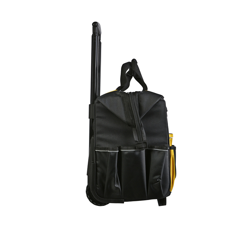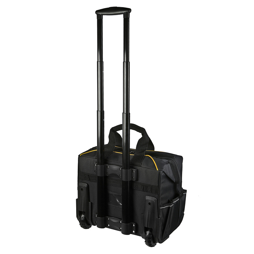 Колёсная система и телескопическая ручка для перемещения тяжёлого инструмента.Дополнительные вставки в стенки сумки позволяют ей лучше держать эргономичную форму при наполнении инструментом.