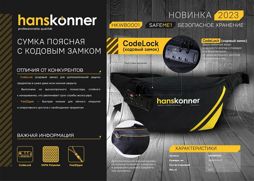 Сумка поясная, 2 отделения, 360x150x70мм, кодовый замок, Hanskonner