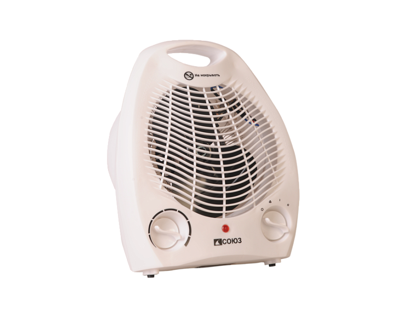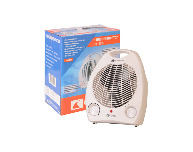 СОЮЗ ТВС-2000 – компактный эргономичный тепловентилятор – предназначен для вспомогательного обогрева и поддержания комфортной температуры в жилых помещениях небольшой площади в холодное время года, а также может использоваться в качестве вентилятора летом. Обладает небольшими массово-габаритными показателями, благодаря чему максимально удобен при перемещении с места на место и при хранении. Корпус прибора выполнен из специального жаропрочного пластика. Модель оснащена игольчатым, мгновенно набирающим рабочую температуру, нагревательным элементом и производительным вентилятором, эффективно распределяющим поток воздуха в помещении. Тепловентилятор максимально прост в использовании – управление осуществляется посредством пары поворотных регуляторов. С помощью первого пользователь выбирает нужный режим работы: вентиляция без нагрева / обдув теплым воздухом / обдув горячим воздухом. Второй регулятор заведует настройкой термостата, необходимого для автоматического поддержания заданной температуры воздуха в помещении. Для обеспечения безопасности при работе, тепловентилятор имеет защиту от перегрева. Размещенный на лицевой панели корпуса, индикатор питания позволяет визуально контролировать состояние работы прибора.