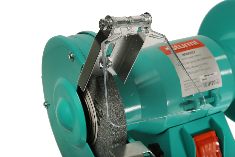 Прозрачный полимерный экран легко поворачивается на нужный угол, защищая оператора от вылета мелких частиц из-под вращающегося точильного круга, и помогая ему безопасно контролировать рабочий процесс.