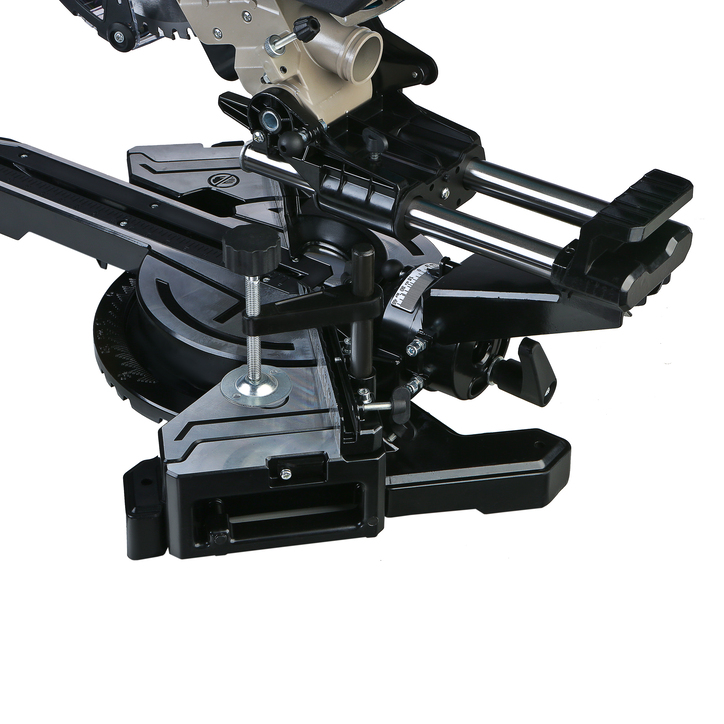 Функция плавного пуска ограничивает стартовые нагрузки и вибрации в целях продления срока службы инструмента. Механизм протяжки пыльной головки расширяет диапазон размеров обрабатываемой заготовки, а фронтальное расположение направляющих разрешает установку модели непосредственно возле стены.  Надежный контроль над торцовочной пилой предоставляет эргономичная D-образная рукоятка.