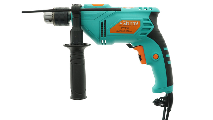 Sturm ID2154 - односкоростная универсальная дрель классической компоновки для бытового применения. Обладая небольшими габаритными размерами и массой модель идеально подходит для решения задач, где от инструмента требуется компактность: например, при необходимости засверливания отверстий в условиях ограниченного пространства, либо на высоте. За счет хорошо продуманной эргономики дрель максимально удобна в использовании: прорезиненные накладки основной рукояти и возможность установки дополнительной рукояти в любом угловом положении способствуют надежности хвата, размещенные непосредственно под пальцами флажковый переключатель реверса и регулятор количества оборотов, гарантируют простоту управления, исключая лишние движения. Предусмотрена фиксация клавиши пуска – дополнительное подспорье при непрерывном использовании. Модель оснащена производительным 650 Вт электромотором, развивающим скорость вращения на валу шпинделя до 3000 об / мин – достаточный запас по мощности способствует высокой эффективности сверления в материалах различной твердости. Важной особенностью дрели Sturm ID2154 является наличие ударного механизма, позволяющего работу с твердыми, но хрупкими материалами (керамика, керамогранит), без риска их повреждения. При необходимости, для повышения производительности, режим удара можно задействовать при сверлении отверстий в кирпичной кладке и легком бетоне. Диаметр шейки корпуса под европейский стандарт - 43 мм – обеспечивает возможность установки дрели в сверлильную стойку.