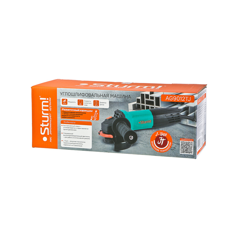 Sturm AG9012TJ – компактная универсальная болгарка (УШМ) под рабочий диаметр диска 125 мм. Инструмент разработан с учетом японской системы обеспечения защиты от разрушающего воздействия абразивной пыли на основные движущиеся узлы и компоненты и способен выполнять любые задачи по резке, зачистке, шлифованию поверхностей из металла, керамической плитки, кирпича и камня. Модель обладает оптимальными массово-габаритными показателями и выверенными пропорциями: малый диаметр корпуса обеспечивает максимальное удобство хвата, нейтральный центр тяжести позволяет уверенно контролировать инструмент в процессе работы даже одной рукой, низкопрофильный корпус редуктора клиновидной формы облегчает работу в местах с трудным доступом. Инструмент оснащен мощным 1000 Вт электромотором с бронированными обмотками ротора и статора, пылезащищенной кнопкой пуска, усиленным высокопрочным редуктором, – все это обеспечивает достаточный запас по надежности и позволяет уверенно использовать Sturm AG9012TJ для работ с большим количеством абразивной пыли. Модель проста в эксплуатации и обслуживании. Снабжена быстросъемным защитным кожухом, который надежно фиксируется при помощи специального зажимного рычага – это дает возможность при необходимости быстро изменять положение кожуха, не прибегая к помощи вспомогательного инструмента, а также удобной патентованной рукоятью со специальным твердосплавным карандашом для нанесения разметки на поверхности любой сложности, включая ржавые, влажные и маслянистые.
