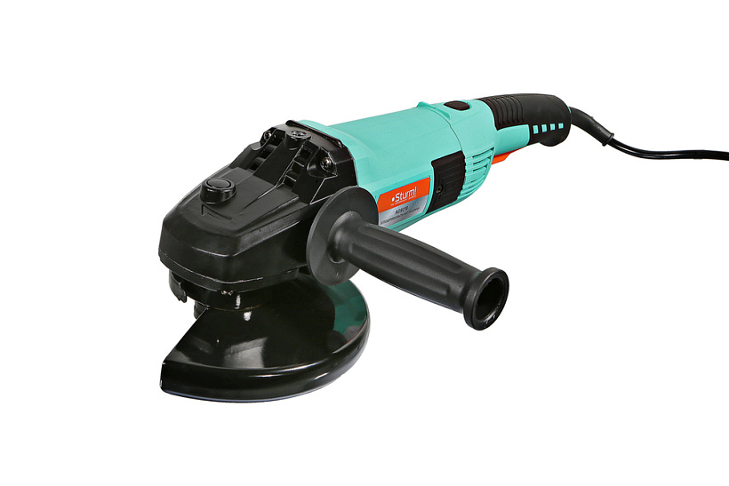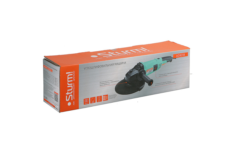 Sturm AG9018 – мощная универсальная болгарка (УШМ) бытового назначения под рабочий диаметр диска 180 мм. Модель оснащена производительным 1800 ваттным электромотором, обеспечивающим достаточный запас по мощности, даже при выполнении энергоемких операций, качественными пылезащищенными подшипниками, а также усиленным редуктором с шестернями повышенной прочности с конической формой зуба, что позволило снизить уровень шума при работе. Инструмент обладает выверенными массово-габаритными показателями и нейтральным центром тяжести, за счет чего удобен в использовании и хорошо контролируется в процессе работы. Дополнительному комфорту пользователя и надежности хвата способствует обрезиненная задняя (основная) рукоять, а также возможность установки передней (дополнительной) рукояти в трех положениях. Благодаря быстросъемному защитному кожуху, надежно фиксирующимся при помощи специального зажимного рычага можно быстро изменять положение кожуха, не прибегая к помощи вспомогательного инструмента. Для удобства продолжительной работы предусмотрена фиксация пусковой клавиши.